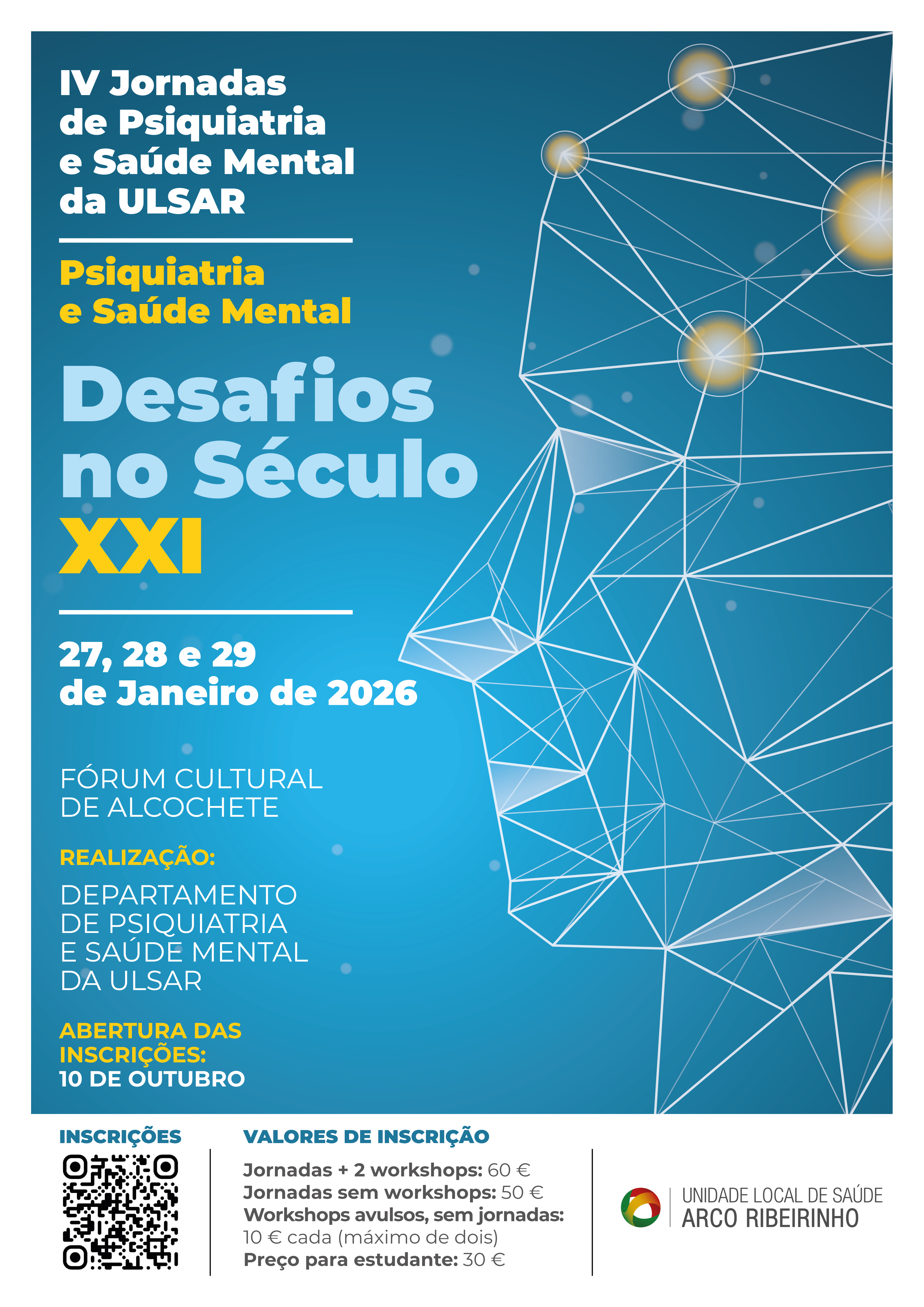 IV Jornadas de Psiquiatria e Saúde Mental da ULSARDesafios no Século XXI27, 28 e 29 de janeiro de 2026 | Fórum Cultural de Alcochete Conheça o programa aqui.Inscreva-se já! Aqui Attachments: Cartaz [ ] Programa [ ]